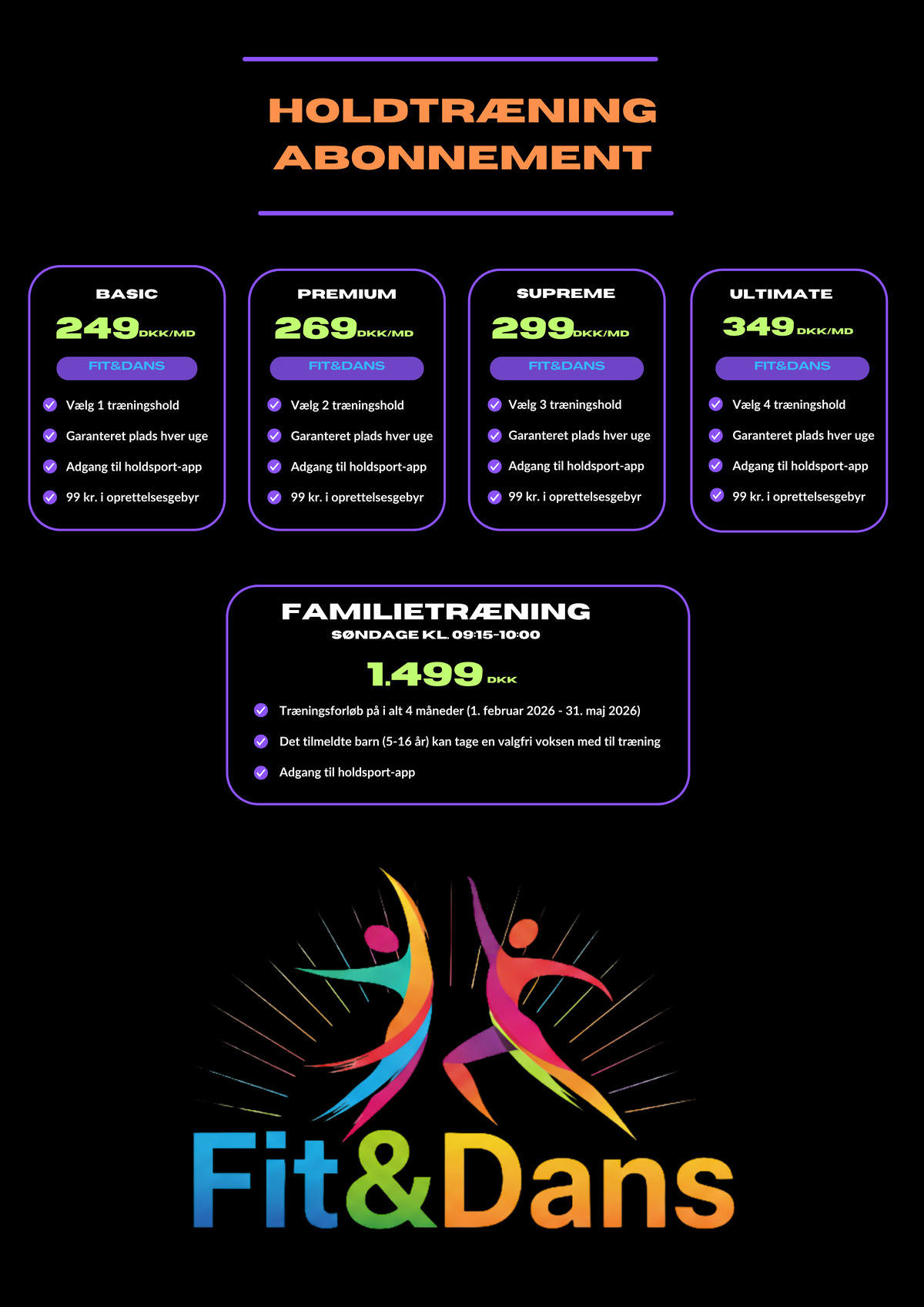 Ved køb af et holdtræningsabonnement kan du tilmelde dig ét eller flere af disse hold: Body Attack, Fit Dance og Hiphop Dance. I løbet af 2026 arbejder vi på at lancere endnu flere spændende hold – Fit&Jump, Step, Power Dance Workout, Tabata Træning, Funktionel Cirkeltræning og meget mere!
